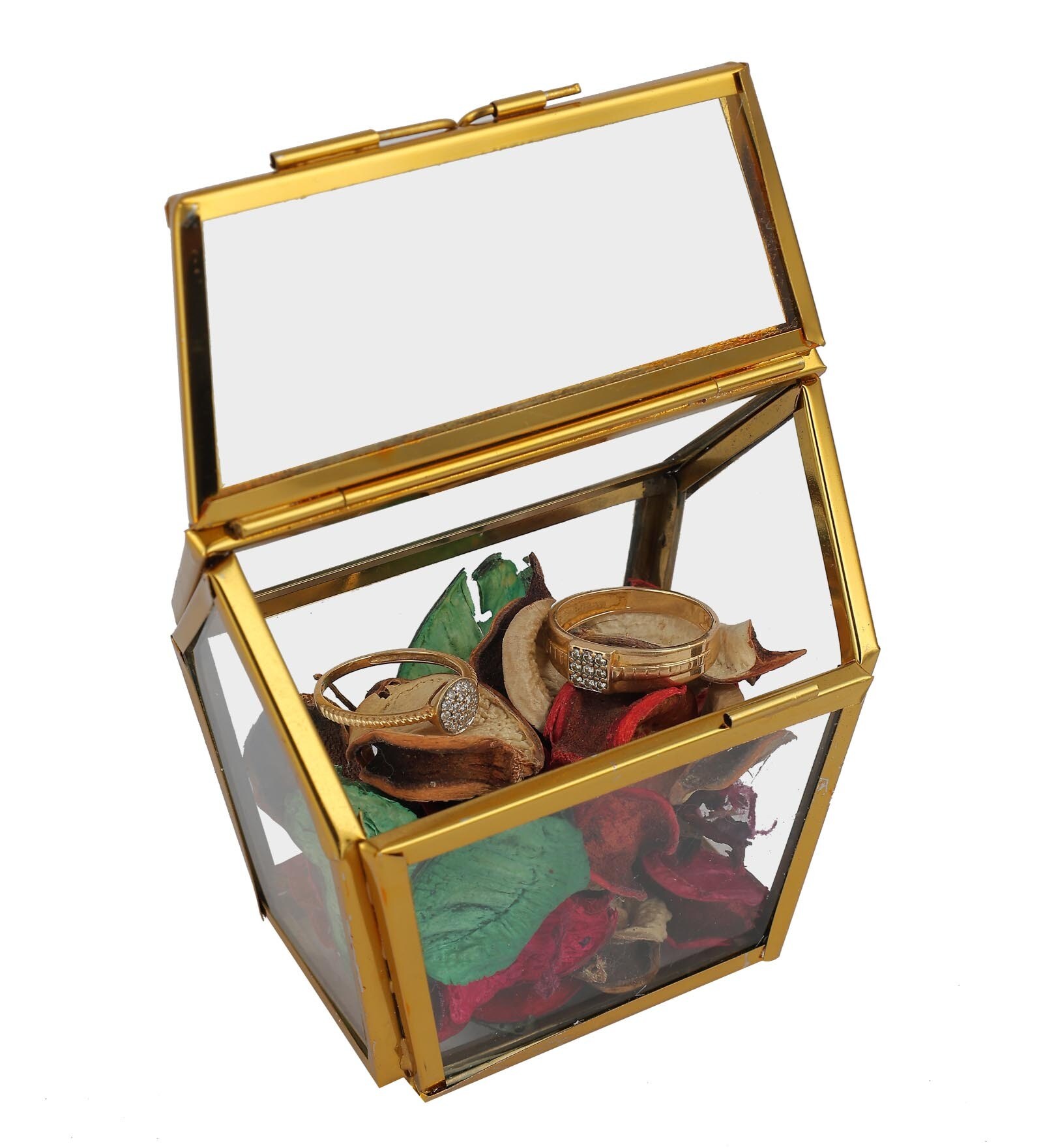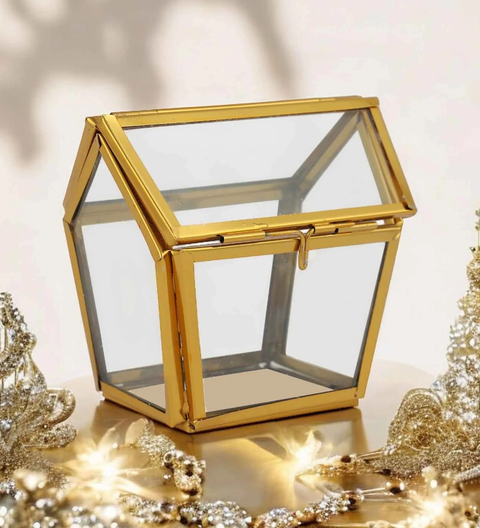 This delightful decorative box features a unique house shape, crafted with elegant brass framing and clear glass panels. It offers a charming and whimsical way to store your favourite jewellery, tiny treasures, or special mementos. The transparent design allows for a beautiful display of its contents, while the sturdy brass ensures durability and a touch of vintage flair. This enchanting piece makes an excellent decorative accent for any room or a memorable gift for a loved one.