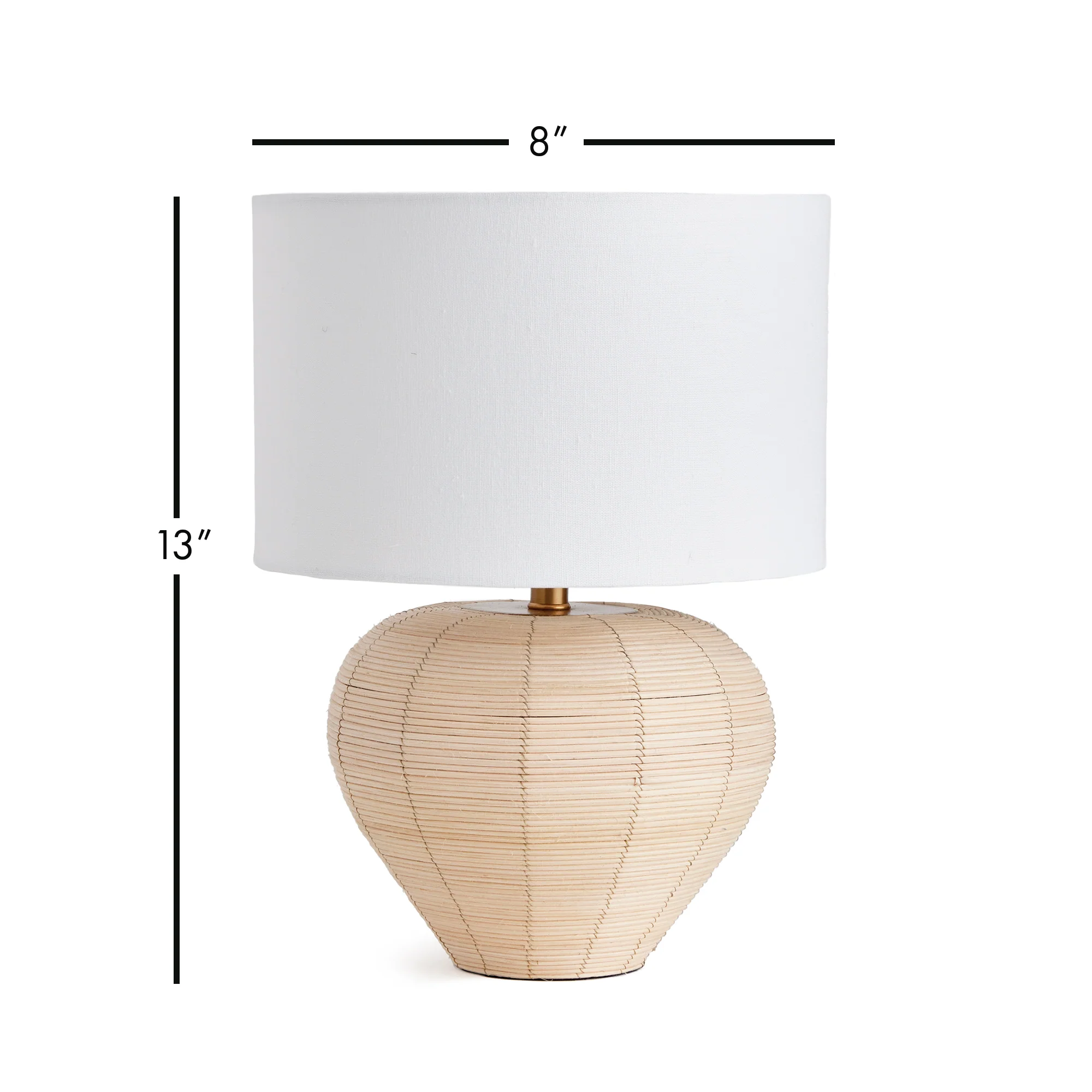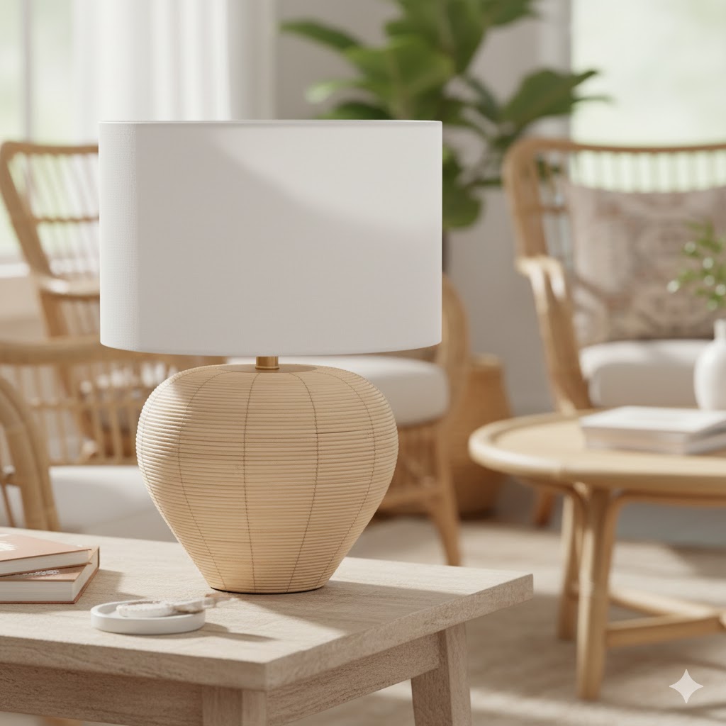This table lamp is the perfect statement piece for your living room, bedroom, or entryway, bringing a cozy and natural touch to your decor. The lampshade is crafted from a Cotton Material, which casts a warm, soft, and ambient glow throughout the space. Its base features a sturdy, natural woven rattan (or cane) material, providing an appealing contrast and stable foundation.